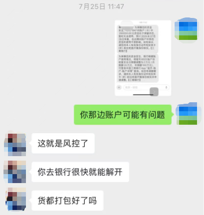 另外,记者也注意到,在他们的聊天截图里,胡某曾在7月25日将张女士收到的银行风险提示短信“账户(卡)中20万元资金处于保留状态,暂时无法使用”发给买家,询问对方账户是否有问题。对此,该买家表示,这属于风控,去银行解开就行。